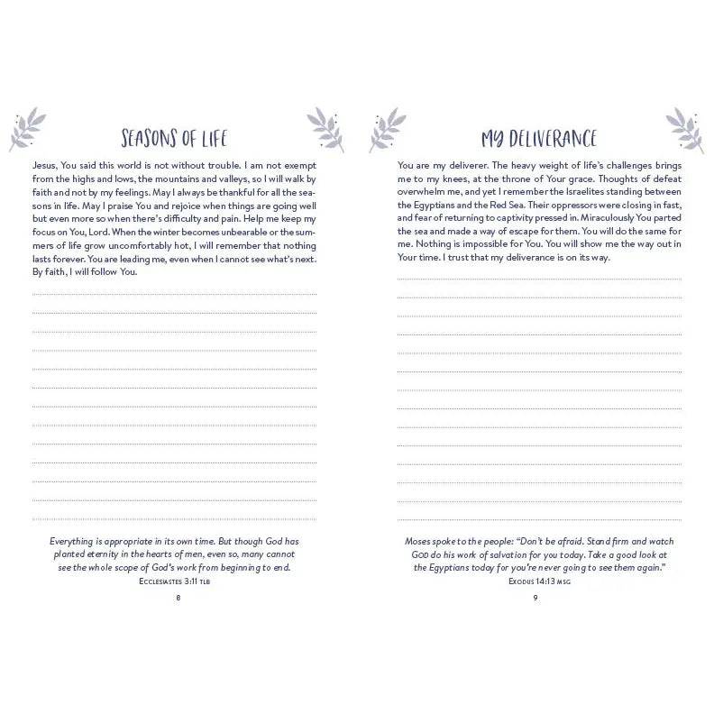 Topics include: - Faith - Salvation - Praying for Others - Boldness - Trust - and more! Each prayer is perfectly paired with a relevant scripture selection and ample journaling space—a fabulous way for you to begin or end your day in quiet fellowship with the heavenly Father.