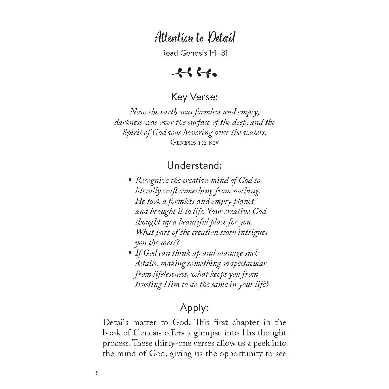 4: Apply. Read a brief devotional based on the scripture you read. Think about what you are learning and how you can apply the scriptural truths to your own life. Minute 5: Pray. A prayer starter will help you to begin a time of conversation with God. The 5-Minute Bible Study for Teen Girls will help you establish the discipline of consistent study of God’s Word. You will find that even five minutes focused on scripture and prayer has the power to make a huge difference in your daily life.